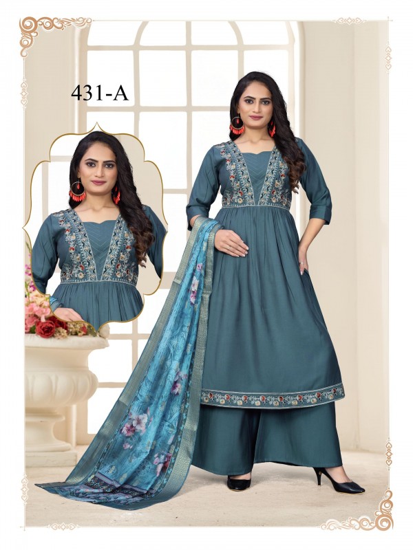 Heavy Bombay Silk V-Neck Kurti Set with Handwork Palazzo & Dupatta