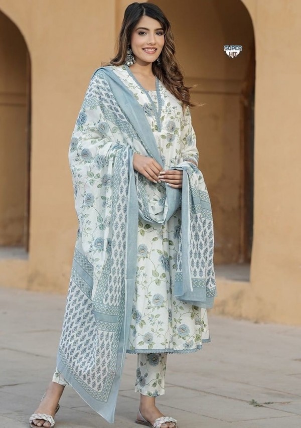 Kamini 7012 Premium Floral Print Cotton Slub Kurti Set with Dupatta Fully Stitched 3-Piece Dress Blue